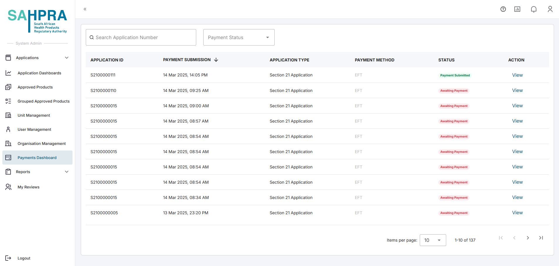 - Find the payment made that you want to review. Click on View to open the application payment information.