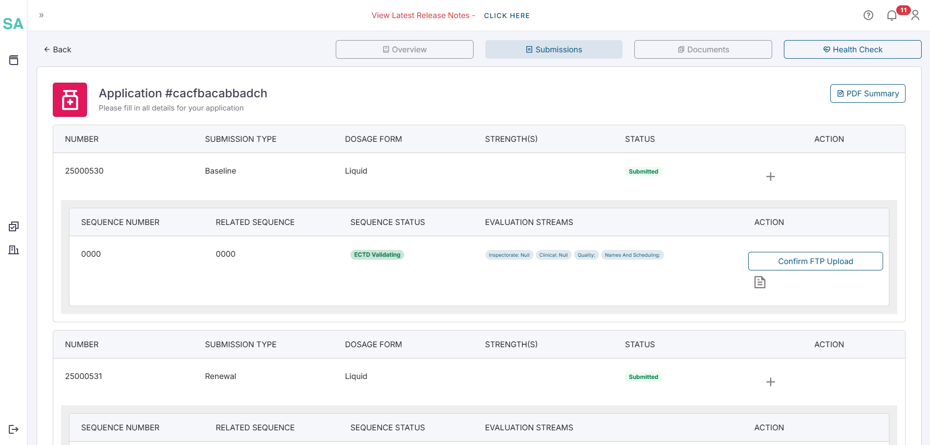 If a partial transfer was done, you will receive a new application ID with the submission for the transfer visible. Please note that a baseline must be submitted in this case before continuing with other actions for the application.