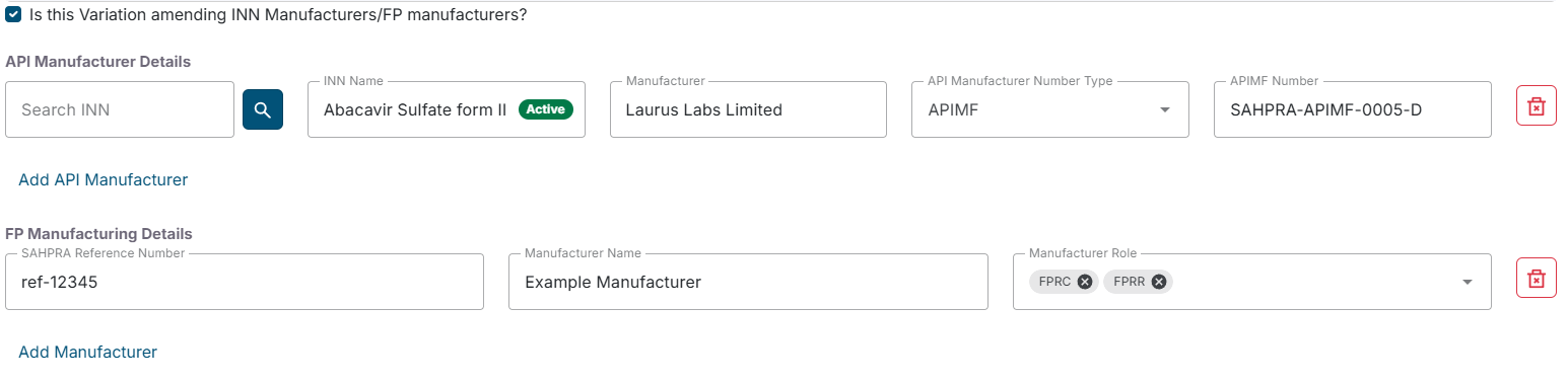 - You can also indicate if the variation is amending INN Manufacturers/FP manufacturers by checking the “Is this Variation amending INN Manufacturers/FP manufacturers?” checkbox.