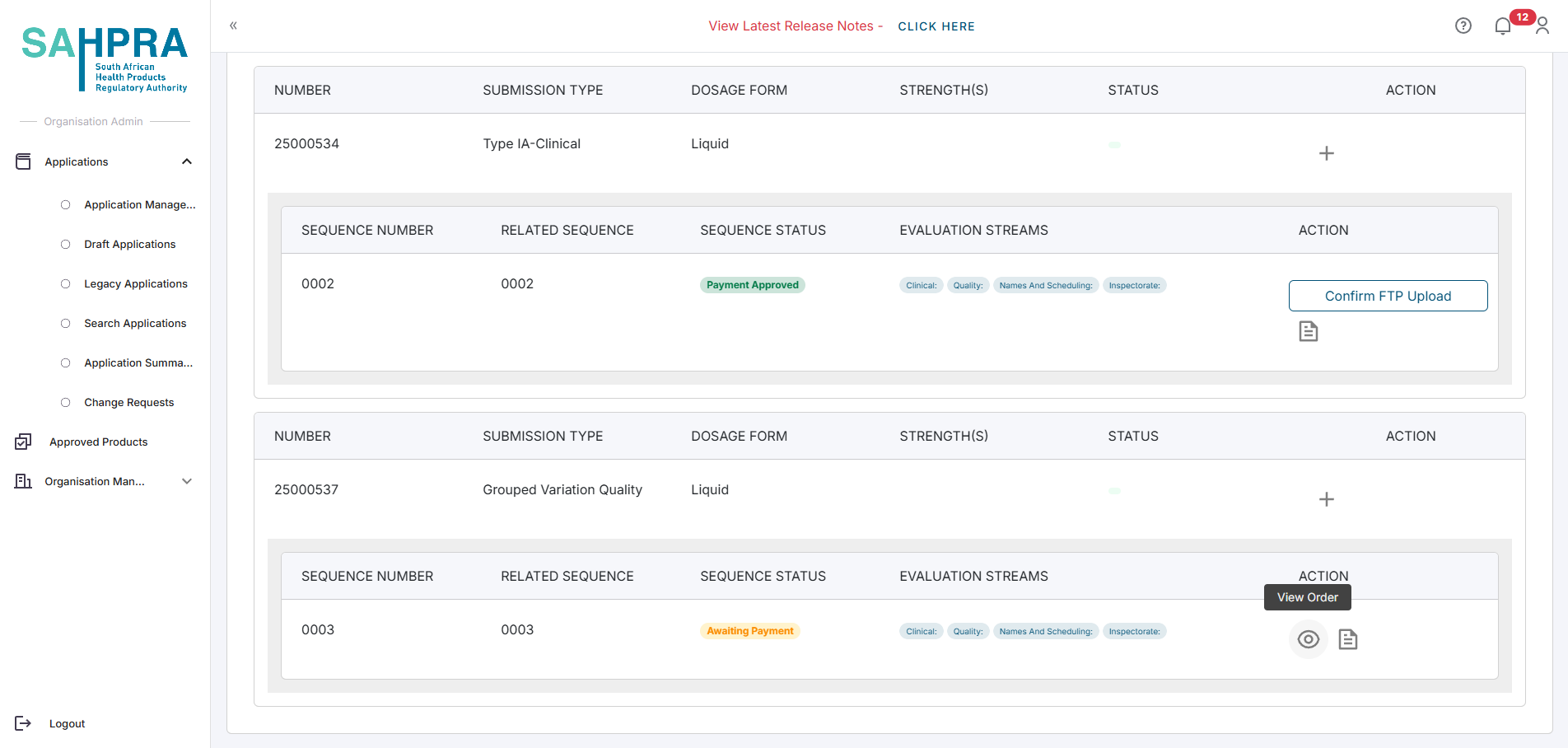 The View Order button will show the generated order based on the application made and will contain the amount payable to SAHPRA. If the submission has no payment required, click on the View Order button and a notice will appear that no payment is required.